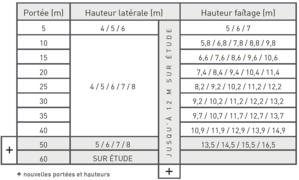 Au cas par cas, notre bureau d’études pourra aussi se positionner sur des projets de 60m de portée libre, et de hauteurs latérales jusqu’à 12m.