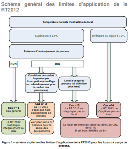 Si le lieu est destiné exclusivement à un processus de fabrication nécessitant un système de chauffage ou de climatisation associé à ce processus de fabrication, la RT2012 ne s’applique pas.