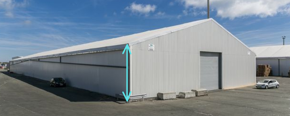 Contrairement à la hauteur au faitage, la hauteur latérale n’intervient que rarement dans le permis de construire. Elle vous permet cependant de déduire la hauteur maximale des accessoires (comme les tribunes dans un complexe sportif) ou des racks de stockage que vous pouvez installer le long des murs du bâtiment. Elle représente donc aussi la hauteur du bardage installé pour fermer celui-ci.