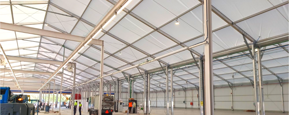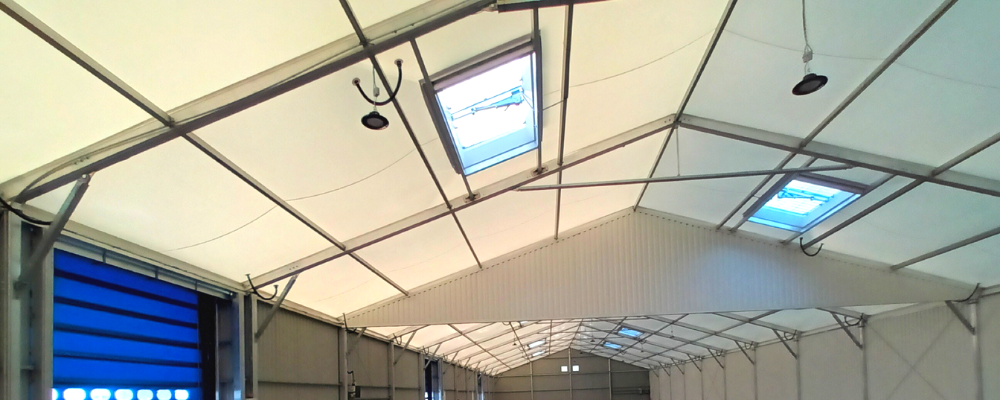 Vous souhaitez plus de lumière naturelle pour votre chapiteau industriel ? Nous sommes aussi capables d’y installer des châssis vitrés ou des baies vitrées suivant vos besoins.