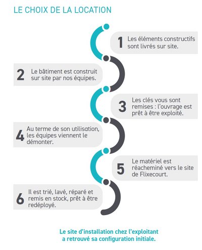 Avec la location d'un bâtiment démontable Spaciotempo, la structure est, au terme de sa durée d'utilisation, démonté, nettoyé, réparé et remis dans le circuit locatif. Les pièces non réutilisables, comme certaines tôles de bardage, sont envoyées au recyclage.