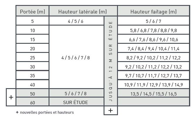 La portée libre du bâtiment démontable Neivalu, modulable par travées de 5 mètres, est comprise entre 10 et 60 mètres. La hauteur à la rive est comprise entre 3 mètres au minimum et 12 mètres au maximum.