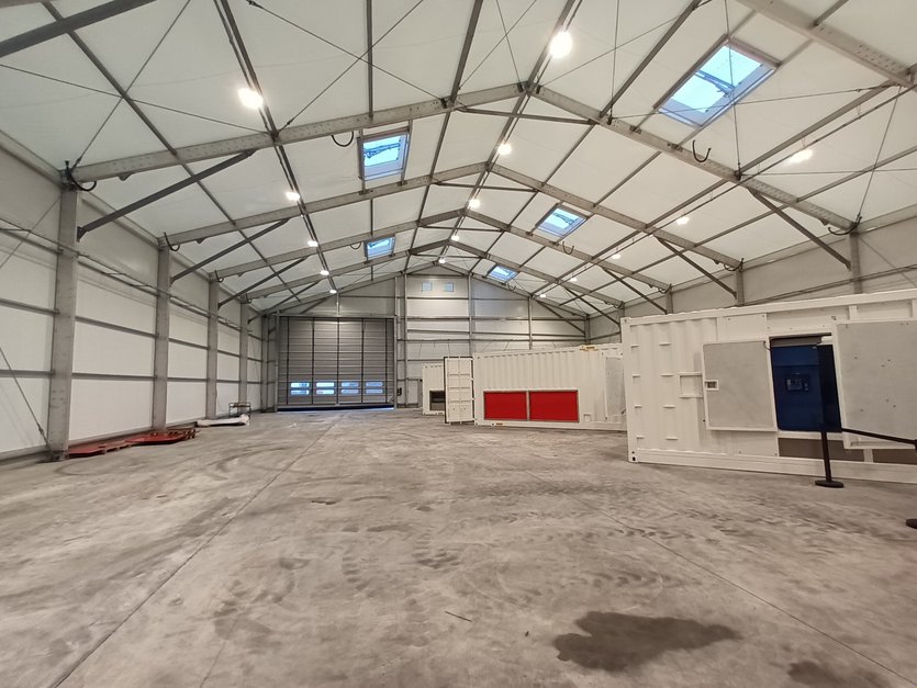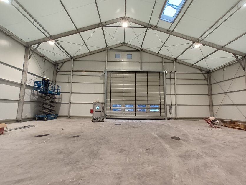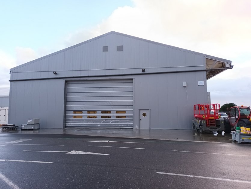 Pour le premier bâtiment, s’agissant d’un atelier pour l’assemblage et l’installation électrique/électronique de leurs produits, le client opte pour un bardage isolant en laine de roche de 50mm. D’une portée de 25m pour une longueur de 50m et une hauteur latérale de 7m, celui-ci offre un espace de travail de 1250m². Deux portes souples de grandes dimensions (8m x 5,7m) sont installées, une en long-pan et une en pignon, pour permettre le passage des engins de travail.