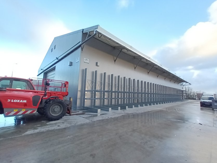 Le second ouvrage, destiné quant à lui au stockage des produits finis, a la particularité d’avoir un débord de toiture en long-pan. Celui-ci permet de couvrir des marchandises sur rack à l’extérieur de l’entrepôt et donc d’optimiser l’espace disponible. Les dimensions du bâtiment sont les mêmes que pour l’atelier de production, soit une portée de 25m pour une longueur de 50m et une hauteur latérale de 7m. Sa hauteur élevée lui permet d’accueillir un ensemble de racks de plusieurs étages, nécessaire à l’entreprise. Il bénéficie lui aussi de deux portes souples identiques à celles de l’atelier.