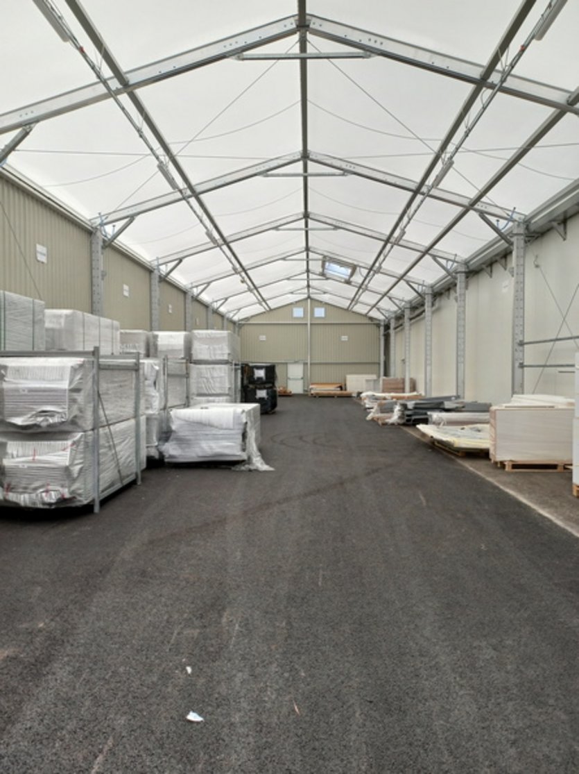 Cet entrepôt de stockage est jumeau du premier dans ses dimensions, soit 10m de portée libre pour 50m de longueur et une hauteur latérale de 5m. Il offre donc 500m² de zone de stockage supplémentaire au client. Il est cependant différent dans ses équipements. Nul besoin cette fois ci de l’isoler ou de le chauffer. Les façades sont donc habillées en bardage acier simple peau. La membrane surpressée est tout de même retenue pour la toiture du fait de ses propriétés anti-condensation, une caractéristique importante pour les produits stockés.